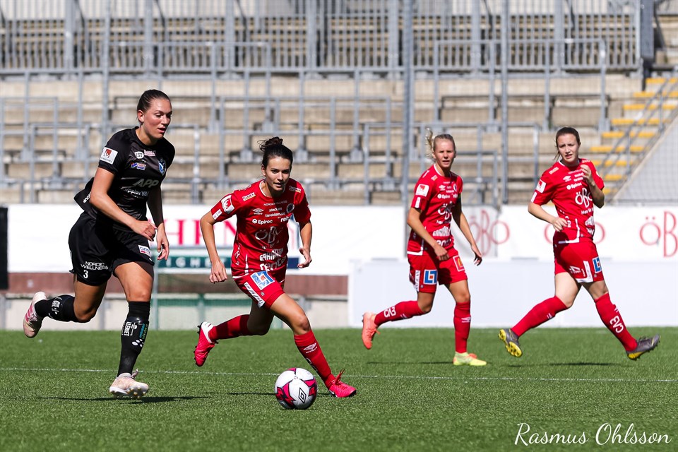 Den tionde omgången spelades på onsdagskvällen när KIF Örebro och nykomlingarna i OBOS Damallsvenskan IK Uppsala drabbade samman på Behrn Arena. Matchen slutade med seger för KIF med 2-1. Men det satt långt inne. Matchinledningen var jämn men KIF skapade de bästa chanserna främst genom Cali Farquharsson, som visade snabbhet och skicklighet i första halvleken. Desto mer tiden gick, desto mer pressade KIF. 1-0 kom efter ett snyggt väggspel mellan Freja Olofsson och Nellie Lilja där förstnämnda satte bollen vid stolpen. Men, dessförinnan hade vi nästan skrivit 0-1 då Uppsala var ytterst nära att ta ledningen efter en spelvändning, men starkt hemjobb av Elli Pikkujämsä räddade målet den gången. Strax före pausvilan kvitterade Uppsala på hörna. Målet kom lite som en blixt från klar himmel då Uppsala inte hade haft något anfall en bra stund innan målet. Snarare var det KIF som hade flera bud på att utöka ledningen då både Cali Farquharson och Karin Lundin hade bollar i ribban, men lagen gick till pausvila med 1-1 på tavlan. I andra halvlek var KIF spelförande men utan att för den skull totalt dominera ute på plan. Halvleken var intensiv och spännande när KIF till slut fick utdelning genom Frida Skogman som nickade in Heidi Kollanens inlägg. Bara några minuter återstod då och Uppsala försökte allt man kunde, men lyckades inte skapa någon het kvitteringschans. KIF höll undan och kammade hem tre poäng, denna härliga onsdagskväll. – Vi tog tre poäng utan att för den skull göra någon perfekt match, men vi skapade mer än vad de gjorde. Men visst, de hade en del kontringslägen, kommenterade evighetsmaskinen Freja Olofsson efter slutsignalen. På plats var också 43 tjejer som deltagit i klubbens Training Camp, för tjejer 12-15 år. De var därmed den första publiken att tillåtas tillträde i årets upplaga av OBOS Damallsvenskan. Vi tackar för stödet! KIF Örebro – IK Uppsala 2-1 (1-1) Målskytt KIF: Freja Olofsson, Frida Skogman Målskytt Uppsala: Nicole Odelberg Modin Varningar: Ellen Karlsson, KIF och Nicole Odelberg Modin, Anna Rakel Petursdottir, Uppsala Matchens lirare: Maja Regnås, KIF och Nicole Odelberg Modin, Uppsala Så här spelade KIF Örebro: Målvakt: Mimmi Paulsson Febo Utespelare: Emma Östlund, Maja Regnås, Elli Pikkujämse, Ellen Karlsson, Nellie Lilja, Freja Olofsson, Nathalie Hoff Persson (ut 72), Cali Farquharson (ut 46), Karin Lundin (ut 82) och Heidi Kollanen. Inhoppare: Frida Skogman (in 46), Sara Lilja Vidlund (in 72), Lindsay Agnew (in 82) Text: Jan Holgersson Foto: Rasmus Ohlsson