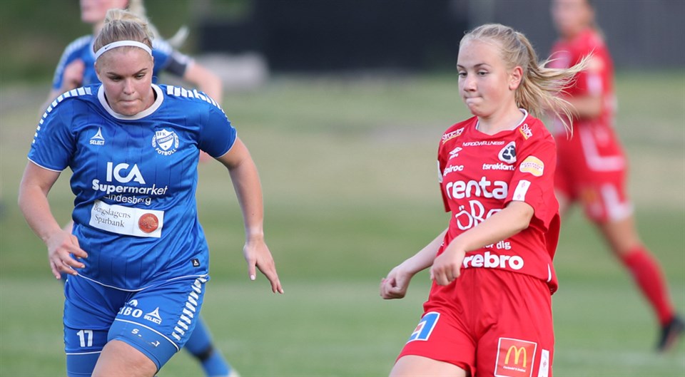 KIF Örebro säkrade femte raka segern när F19 besökte Eskilstuna i helgen. KIF inledde på bästa tänkbara sätt och smällde in ett drömmål i matchminut 1 via Alva Hyttinen. Ett gediget försvarsspel följde sedan matchen igenom. KIF kunde punktera med att göra 2-0 genom Cornelia Karlsson, som vackert satte bollen i krysset inne i straffområdet. – Sett över 90 minuter en jämn match mellan två bra fotbollslag. Kikar vi på statistiken efter matchen hade kanske oavgjort varit ett rättvist resultat. Men vi gör det bra som håller ihop och vinner, säger Niklas Christensson, tränare i KIF Örebro F19, och fortsätter: – Matchen börjar med att vi gör ett mål som går in som topp tre av årets snyggaste för oss. Lite skönt klapp-klapp där spelarna visar högkvalitativa fotbollsaktioner med allt från väggspel till touch och inspel så hittar vi en inrusande Alva på bakre ytan och 1-0. Sedan tillåter vi Eskilstuna att ha lite för mycket boll i de första 20 minutrarna av matchen, och de attackerar precis som vi förutsatt med lite längre bollar ut i ytterzon och med spelare som droppar och byter platser och gör det svårt för oss i försvarsspelet. Trots det skapar de inte direkt några högkvalitativa målchanser på grund av vårt stabila försvarsspel förutom ett kanonskott i ribban. Efter en vattenpaus på en stekhet Tunavallen får KIF mer ordning och struktur på både försvarsspelet men också på det egna passningsspelet vilket gör att första halvan av matchen totalt sett är jämn både i spelet och till målchanser. – Vi hade innan matchen pratat om vikten att våga spela igenom lagdelar och det gör man oftare i denna match än tidigare men har trots det svårt att komma igenom på sista tredjedelen, kommenterar Christensson. I andra halvlek ser matchbilden ut som i första. Båda lagen försöker bygga bakifrån och har lite olika kombinationer för att försöka komma fram men det slutar oftast med att respektive lags backlinje plockar bort det innan det riktigt hettar till. Med 30 minuter görs det en del byten och KIF får ny energi och kan genom ett fint inspel hitta Cornelia i boxen som distinkt trycker dit bollen och 2-0 är ett faktum, vid tillfället kanske inte helt rättvist men inte heller orättvist. I slutet av matchen trycker Eskilstuna på för att försöka forcera – men då kliver Lisa Davidsson fram och gör en dubbelräddning som får Jennifer Falk i damlandslaget att vara osäker på sin landslagsplats. I övrigt stoppas det mesta av ett gedigt kollektivt försvarsspel från KIF Örebro. Innan domaren blåser av matchen hittar han en straff i matchminut 90 till Eskilstuna. Som de också gör mål på. – Jag kommenterar aldrig domarens beslut, men är det straff så kommer vi behöva ändra vår utbildningsplan hur man försvarar i straffområdet, noterar Niklas Christensson, och avslutar: – Målet i sig är välförtjänt sett till deras chanser över 90 minuter, men det är surt att det kommer. Vi hade så gärna sett att laget fått hålla nollan. Slutresultatet skrivs till 1-2, och därmed tre friska poäng för KIF Örebro F19 som reste hem till Örebro som fortsatt serieledare. Noterbart är också att F17-spelaren Klara Aronsson gjorde debut i F19-sammanhang. Eskilstuna F19 – KIF Örebro F19 | 1-2 (0-1) KIF Örebros startelva: Lisa Davidsson (MV), Sophia Redenstrand (ut 45), Ebba Cabander, Clara Heiche, Annie Holst (ut 85), Alma Nygren (ut 60), Rebecka Mannström, Elin Lindbäck, Alva Hyttinen (ut 60), Lisa Aronsson, Cornelia Karlsson Avbytare: Moa Zakrisson (MV), Heidi Kollanen (in 60), Wilma Forsberg (in 60), Josefin Eklund (in 45), Klara Aronsson (in 85) Foto: Rasmus Ohlsson