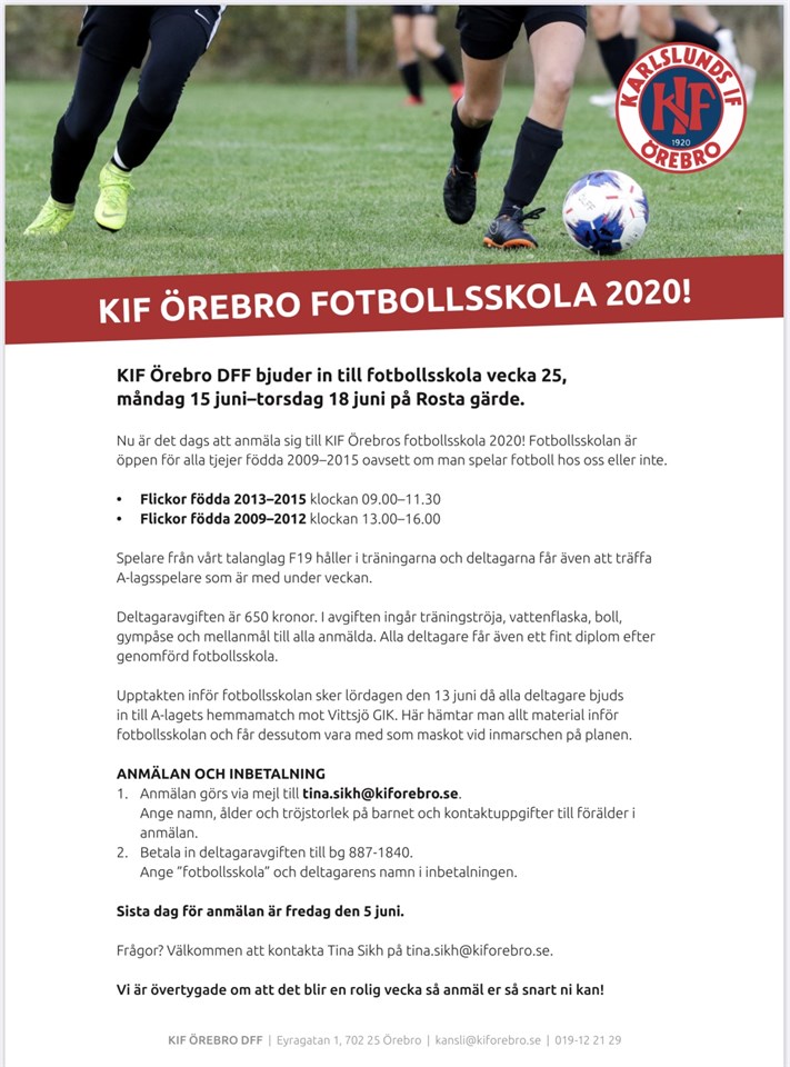 Nu kan man anmäla sig till sommarens fotbollsskola som kommer att gå av stapeln vecka 25! Se också till att sprida infon vidare så att alla tjejer födda 2009-2015 kan börja sommarlovet med en fotbollsvecka i Kif! F2013 28 feb 2020 0kommentarer