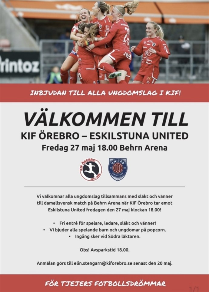Nästa fredag, den 27 maj, bjuder KIF:s A-lag in alla ungdomslag med familj och släkt till Behrn Arena när de möter Eskilstuna. Gratis inträde! Vill man inte titta på hela matchen går det självklart bra att stanna så länge man vill/orkar. Evenemangsansvarig vill veta ungefär hur många som kommer. Meddela i kommentarsfältet hur många ni vill anmäla så vidarebefordrar vi det! Anmäl senast på fredag, den 20 maj kl 15! Vi hoppas att många vill komma och att det blir en riktig publikfest ⚽