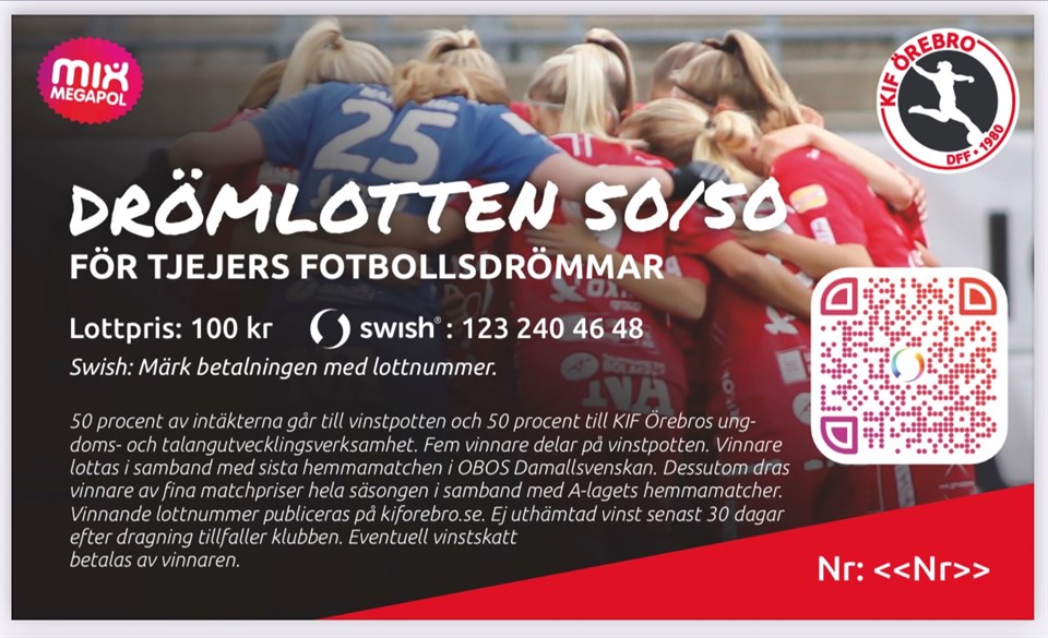 I samband med morgondagens träning kommer jag att dela ut 5 st Drömlotter till varje spelare. Dessa ska säljas så snart som möjligt, gärna inför damallsvenska hemmapremiären söndag 3 april. Lotten säljs till förmån för KIF Örebros Ungdoms- och Talangverksamhet samt för det egna laget. Förtjänsten fördelas 50% till vinstpotten (dras vid sista hemmamatchen i november), 25% till klubben och 25% till laget. Lotten säljs via swish och kostar 100kr. Kravet är 5 lotter/spelare men kan man får man så klart sälja fler. Vid varje hemmamatch kommer det dessutom att vara en Drömlottsvärd som lottar ut ett pris just för den matchen. På baksidan av lotten finns också två attraktiva erbjudanden från Smörgåsbutiken och Peak Performance.