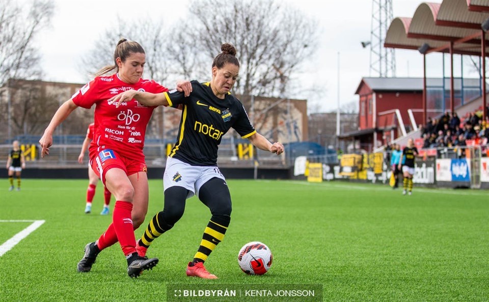På Skytteholms IP körde årets säsong av OBOS damallsvenskan igång för KIF Örebro. AIK stod för motståndet och dessvärre var det hemmalaget som drog det längsta strået och vann denna premiäromgång med 2-0. Båda lagen inledde matchen med ett ganska avvaktande spel. Mycket bollande fram och tillbaka utan några direkta målchanser. Detta ändrades dock i den tolfte minuten när AIK satte 1-0 genom Hayashi. Kort därefter följde en sekvens där KIF Örebro hade tre hörnor på raken. Dock utan att lyckas få in bollen i målet. Skada ledde till tidigt byte Maja Regnås Valcic åkte på en skada i den tjugonde minuten. Dessvärre var det tillräckligt allvarligt för att Maja ej skulle kunna återvända till matchen. Detta ledde till att Frida Abrahamsson byttes in. I den 45:e minuten åkte Jenna Hellstrom på ett gult kort. Ett tråkigt avslut på en halvlek där AIK var det något starkare laget. Starten på andra halvlek tillhörde KIF Örebro Vi fick se ett helt annat KIF Örebro i inledningen av andra halvlek. Fart, initiativ och offensiv. En period på ungefär 10 minuter som bådar gott inför resten av säsongen. I minut 63 gjorde KIF ett dubbelbyte. Emilia Pelgander och Katie Lockwood klev av och in kom Berglind Rós Àgústsdóttir och Nathalie Hoff Persson. KIF Örebro fortsatte att slå många hörnor även i andra halvlek. Varav några av dessa hade kunnat leda till ett mål med lite mer tur. I minut 76 genomförde KIF sitt sista byte för dagen. Wilma Öhman gick ut och in kom Amanda Rantanen. AIK avgjorde med mindre än kvarten kvar I minut 78 satte AIK 2-0 genom Jenny Danielsson och det kändes lite som att luften gick ur matchen. KIF-spelarna fortsatte kämpa in i det sista men idag ville det sig inte riktigt. Nu håller vi tummarna för seger i hemmapremiären mot Djurgården söndagen den 3 april. AIK – KIF ÖREBRO 2-0 (1-0) Startelva KIF Örebro: Enblom (MV), Pikkujämsä, Regnås Valcic (ut 20), Kovacs, Sandberg, Wickenheiser (K), Em. Pelgander (ut 63), Hellstrom, Lockwood (ut 63), Kollanen, W. Öhman (ut 76) Avbytare KIF Örebro: M. Öhman (MV), Abrahamsson (in 22), Hoff Persson (in 63), Frisk, El. Pelgander, Rós Àgústsdóttir (in 63), Rantanen (in 76) Bilden i artikeln är tagen av Kenta Jonsson/Bildbyrån.
