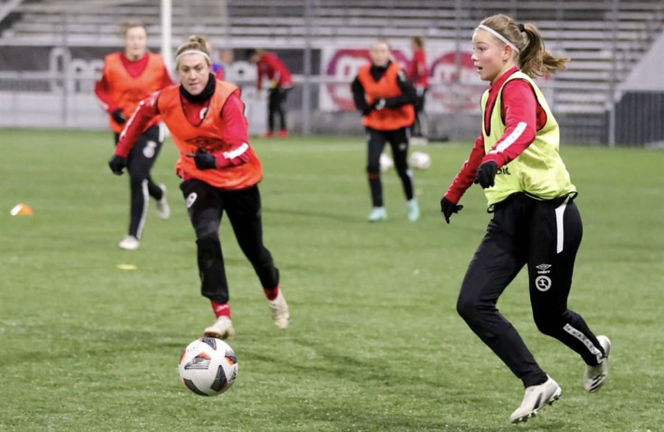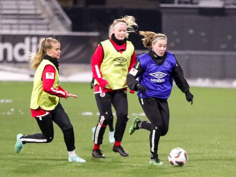 Under måndagseftermiddagen var det äntligen dags att samla A-laget efter uppehållet och påbörja den gemensamma träningen inför säsongen 2022. 18 spelare bildade en tydligt inspirerad grupp som äntligen fick springa ut på Behrn Arena tillsammans med tränarna med Rickard Johansson i spetsen. I väntan på transatlanterna som ansluter i slutet av januari och blrjan av februari förstörktes dagens trupp msd spelare ur F19 (som paralellt körde igång sin träning på andra sidan planen). Det var positiva miner när KIF Örebro drog igång försäsongen: – Det känns fantastiskt, jättebra, utropar Cassandra Larsson som fick fjolårssäsongen förstörd av skador och bakslag: – Det var inte lätt att komma tillbaka. Jag tvingades göra en andra operation. Men nu är jag starkare än innan skadan efter allt gymmande. Nu ska jag komma tillbaka helt med fotbollen och jag ska göra allt för att få speltid när matcherna börjar, fortsätter ”Cassie”. Träningen inleddes med uppvärmning i mittcirkeln och därefter spelövningar inriktade på snabbhet, rörelse, kamp och kortpassningsspel. Målvakterna Tove Enblom och Moa Öhman tränade såklart också, främst med tunga skott och returer. Träningen avslutades med matchspel åtta mot åtta. Träningen var intensiv med näsblod och flera som, trots minusgraderna, spelade i kortbyxor. Dessutom spetsades det hela till av att förra KIF-stjärnan Freja Olofsson passade på att träna med KIF nu när det är uppehåll ”over there” i NWSL – Kul att vara med. Jag kommer att köra nästan alla träningar i januari, berättar Freja Olofsson som till vardags hör hemna i Racing Louisville. Maja Regnås Valcic är tillbaka efter knä- och fotskador. – Jag har längtat länge efter detta! När jag fick mina skador bestämde jag att jag bara ska tillbaka till 2022. Jag är helt bra nu, men kör lite stegrande för att inte riskera bakslag, kommenterar en glad Maja Regnås Valcic. Nathalie Hoff Persson gör sin tredje säsong i KIF: – Det är kul att vara igång igen. Det är såklart skönt att vara ledig, men det blir också enformigt med alla besök på gymmet. Var det ett svårt beslut att skriva på för en tredje säsong med KIF? – Jag hade andra förslag att fundera över. Jag trivs dock i KIF och har haft två utvecklande år i klubben. Detta tillsammans med att KIF:s spelstil passar mig och också det att vi behåller många spelare i truppen i år gjorde det till ett rätt enkelt val att skriva på för KIF, säger Nathalie Hoff Persson. Nu väntar tuffa säsongsförberedelser ocj träningsmatcher innan tävlingsmatcherna i Svenska Cupen drar igång om en dryg månad. Text: Jan Holgersson Foto: Rasmus Ohlsson