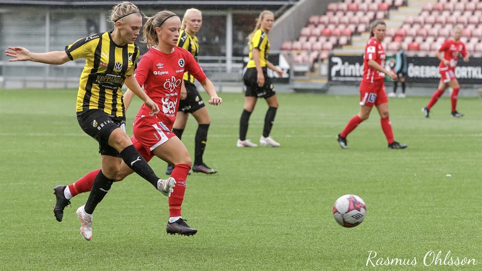 KIF Örebro F19 fick i helgen en tuffare drabbning med Häckens F19-lag än senast. Mötet slutade 2-2, efter att KIF tappat en 2-0-ledning. KIF Örebro F19 reste ned till Göteborg för att ta sig an Häcken. I förra mötet vann KIF med 5-1. Men laget var införstådda med att det skulle bli en tuffare match denna gången. Och trots en tydlig KIF-ledning så slutade matchen tillslut oavgjort efter ett sent kvitteringsmål från Häcken. – Sett till matchbilden så var resultatet ändå rättvist, men det är såklart tungt att åka på ett sent mål och därmed tappa segern, säger Micke Kindgren, tränare i F19. KIF kommer inte in i matchen riktigt som önskat, vilket gav Häcken ett antal goda chanser. Men Lisa Davidsson i målet står för ett par riktigt vassa räddningar, vilket ger KIF möjligh att hitta rät i spelet och matchen. Målskyttet inleds av Rebecka Mannström, som drar en hörna rakt i mål. 2-0 till KIF kommer även det i första halvlek efter att Ebba Cabander spelar fram Lisa Aronsson som avslutar snyggt. – I halvtid leder vi med 2-0 men är ändå inte riktigt nöjda med vår prestation. För många felpass och ett inte helt synkat anfallsspel, menar Kindgren. Andra halvlek inleder KIF bättre. Både försvarsspelet positionsspelet ser bättre ut, även om det fortfarande hackade lite i skapandet av de rena målchanserna. – Och kom vi väl till de rena målchanserna så var vi tveksamma, och sökte oftare passningar till medspelare än att gå på egna avslut. Istället reducerar Häcken till 1-2 efter en fin prestation med drygt 25 minuter kvar. Det ger Göteborgarna energi, men ändå inte tillräckligt farliga målchanser. Det skulle dröja tills det återstod någon minut av matchen innan Häcken fick in sitt andra mål. Slarv i markeringarna vid en Häcken-hörna räckte för att ge läget hemmalaget sökte - vilket faställde matchens resultat till 2-2 och delad pott. – Totalt sett en match där båda lagen nog förtjänad en varsin poäng. Vi är inte riktigt nöjda med vår egen prestation över 90 minuter, då vi inte kommer upp i den nivå vi vet att vi har och vill vara på, säger Kindgren. Noterbart från mötet är att F17-lagets Emma Selldén och Stina Dahlman gjorde sina F19-debuter. BK Häcken F19 – KIF Örebro DFF | 2-2 (0-2) Mål KIF: Rebecka Mannström, Lisa Aronsson Startelva: Lisa Davidsson (MV), Ebba Cabander, Eila Wennerholm (ut 75), Clara Heiche, Josefine Eklund (ut 46), Cornelia Karlsson, Rebecka Mannström, Elin Lindbäck (ut 60), Wilma Forsberg (ut 46), Lisa Aronsson Avbytare: Moa Ivansson (MV), Stina Dahlman (in 75), Selma Rajakangas (in 46), Linnea Wallin (in 60), Emma Selldén (in 46) Foto: Rasmus Ohlsson