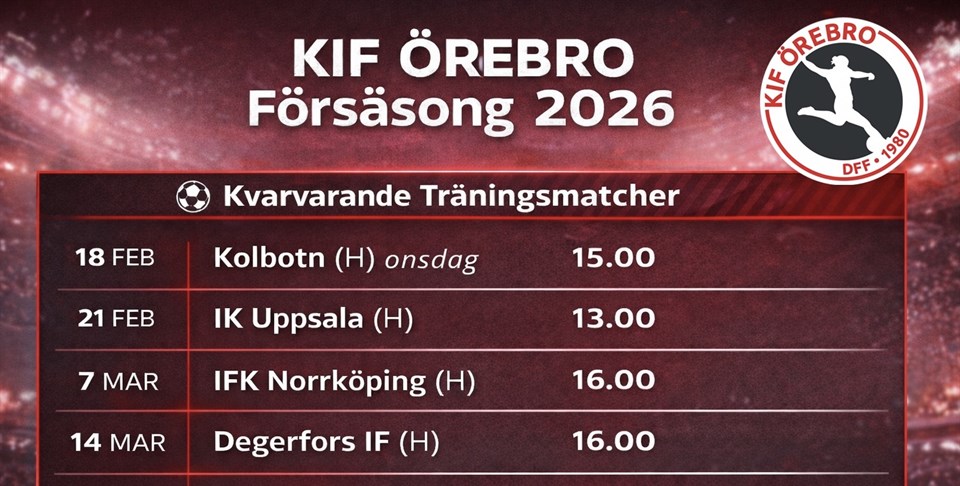Försäsongen fortsätter och vi går nu in i de avslutande träningsmatcherna inför tävlingssäsongen 2026. Efter en intensiv inledning på året återstår flera viktiga tester där laget fortsätter att bygga relationer, tempo och matchform. Vi ser fram emot följande matcher: 18 februari – Kolbotn (H), kl. 15.00 21 februari – IK Uppsala (H), kl. 13.00 7 mars – IFK Norrköping (H), kl. 16.00 14 mars – Degerfors IF (H), kl. 16.00 Träningsmatcherna är en viktig del av våra förberedelser och ett steg närmare seriepremiären. Vi hoppas att se så många som möjligt på plats och bygga energin tillsammans inför säsongen! Håll koll på vår Instagram för ytterligare information och uppdateringar inför matcherna. KIF ÖREBRO DFF (Obs! För alla träningsmatcher gäller valfri entre)