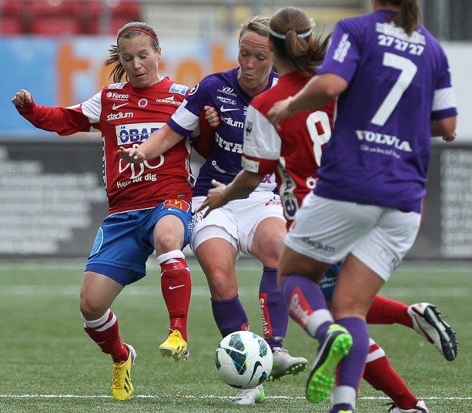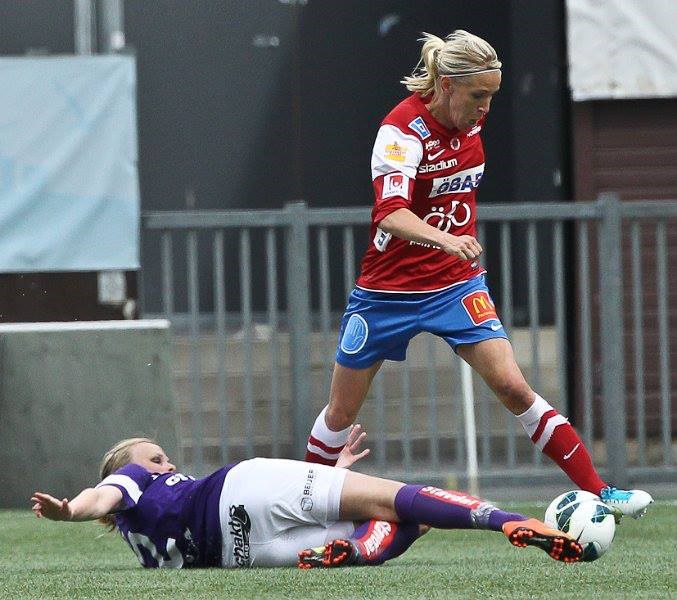 Efter en mållös första halvlek så blev det en betydligt mer händelserik andra halva och när slutsignal ljöd så visade tavlan mindre roliga 1-5. Det var mycket spel på mittplanen under de första 45 minuterna och det skapades bara några halvchanser. Det var många närkamper i öppningen av matchen, men också spel med flera fina kombinationer från båda lagen. I den andra halvlekens början tilldelades Irena Martinkova sitt andra gula kort och förpassades således av planen. Tre minuter behövde gästande Linköping på sig för att utnyttja sitt överläge då Stina Blackstenius satte ledningsbollen. KIF fortsatte trots allt att spela på och det skulle ge belöning då samarbetet mellan Sarah Michael och Sanna Talonen betalades med kvittering till 1-1 i den 60:e minuten. Sarah hittade Sanna med ett perfekt inlägg med mål som följd, men måljublet hann knappt tystna innan LFC återtog ledningen genom Pernille Harder bara minuten efter. Detta var början till slutet och LFC gjorde inte mindre är tre mål inom loppet av sju minuter innan tvåmålsskytten Stina Blackstenius fastställde slutresultatet på övertid. Nu återstår en omgång och det finns fortfarande möjligheter att ta bronsmedaljen som fjärdeplatsen innebär, men då krävs vinst eller oavgjort i den sista matchen mot Vittsjö och att vi sen får förlita oss på att Sunnanå minst tar en poäng i bortamötet mot Kopparbergs/Göteborg.