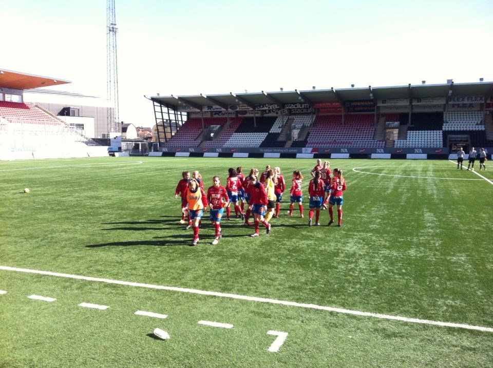 För första gången på två säsonger så spelar vi en kvällsmatch. Vi tog emot karlstadtjejerna Qbik hemma på Behrn Arena idag. Matchen sparkades igång 19:30. Startelvan: Lina - Johanna, Rebecca, Lundqvist(C), Ahlin - Lejla, Ellen, Stina - Adde, Sjölla, Sejde Avbytare: Fanny, Hannah, Wilma, Linnea, Gabbe När matchen blåses igång så tar det drygt 40 sekunder innan vi får en het målchans. Sjölla får en djupledsboll i ett svårt läge, där hon rundar målvakten, men får bollen lite för långt ifrån sig så att hon blir tvungen att vända. Qbik reder ut den chansen. 1-0 målet kommer i den 12e minuten när Adde kommer runt på sin kant och slår in bollen till Sejde som så när sätter bollen. Men istället dyker Stina upp och trycker in den. 1-0 efter dominans från våran sida. Halvleken fortsätter egentligen med stort bollinnehav från våran sida och där Qbik sticker upp med kontringsförsök. Vi har ett friläge där Adde kommer fri med målvakt och bommar. Sejde likaså. Qbiks hetaste chans kommer i slutet på första där bollen slås in tidigt och vi missar helt i rensning. Bollen går fram till en Qbikspelare som tar emot och skjuter. Lina gör en fantastisk räddning! Halvleken och matchen slutar 1-0 till oss. Det ska nämnas att Qbik får till ett litet tryck i slutet, utan att egentligen skapa någonting, men vi gör det onödigt spännande. Det ska inte få hända. Vi har våra chanser, men gör inte mål. Vi skulle ha punkterat matchen i första halvleken. Dock så vinner vi och är det bättre laget, så det är inget snack om saken. Vi gör en helt okej insats idag. Defenetivt ingen dålig match i alla fall. Andra raka! Matchens plus...........? Emelie Lundqvist(C): Har skolats om till mittback och gör det väldigt bra. Spelar väldigt stabilt och gör inga misstag idag. Klart godkänt! Utöver Emelie så är det egentligen ingen som höjer sig idag. Vi har Ellen på mitten som sliter och krigar i andra halvlek, men inte riktigt samma Ellen som i söndags. Vi har Sjölla på topp som försöker och försöker, men blir ganska bra bortplockad av Qbiks mittback. Plus till henne som lyckades med det. Nu blir det att ladda om batterierna till dubbelmötet i Malmö nu till helgen. Vi åker 07:30 på lördag morgon och kommer att bo på S:t Jörgen i Malmö. Det finns platser i bussen till dom föräldrar som vill följa med. Tackar som vanligt till publiken som var där idag och hejade fram oss till seger. //Coach